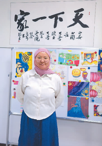 學(xué)生麗扎·穆罕默德在孔子學(xué)院書畫墻前留影。本報記者 劉少華攝