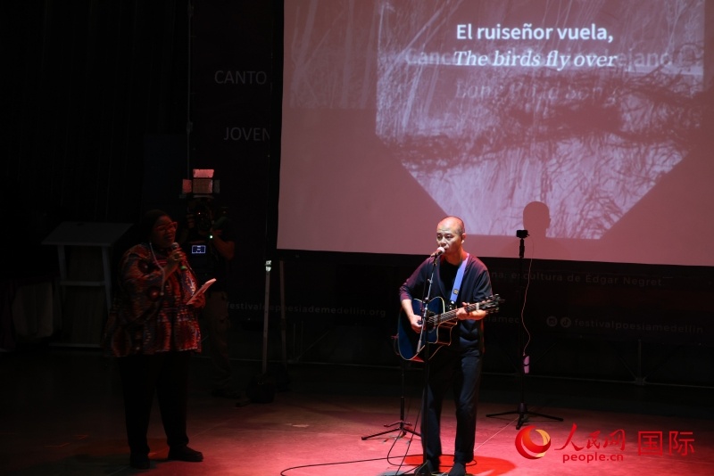 中國歌手蘇陽在第三十四屆麥德林國際詩歌節(jié)開幕式上演唱中文歌曲,南非詩人莫卡蒂加入表演。人民網(wǎng)記者 時(shí)元皓攝