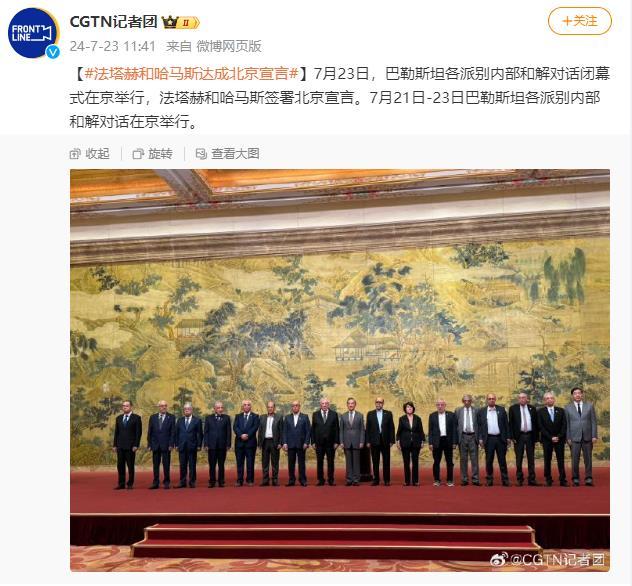 據(jù)@CGTN記者團 消息,7月23日,巴勒斯坦各派別內(nèi)部和解對話閉幕式在京舉行,法塔赫和哈馬斯簽署北京宣言。7月21日-23日巴勒斯坦各派別內(nèi)部和解對話在京舉行。