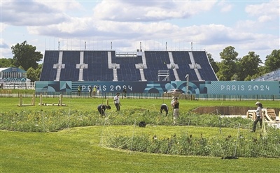 7月17日,工作人員在2024年巴黎奧運(yùn)會(huì)馬術(shù)賽場(chǎng)布置場(chǎng)內(nèi)景觀。新華社記者 賀長(zhǎng)山攝