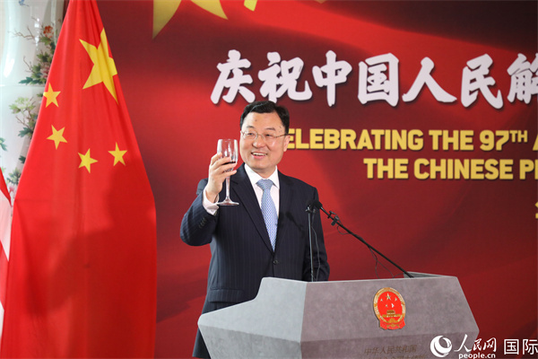 人民網(wǎng)華盛頓7月26日電 (記者李志偉)當(dāng)?shù)貢r(shí)間7月25日晚,中國(guó)駐美國(guó)大使館舉行慶祝中國(guó)人民解放軍建軍97周年招待會(huì)。中國(guó)駐美國(guó)大使謝鋒夫婦、井泉公使、劉展國(guó)防武官,美政府和軍隊(duì)官員,各界友好人士,各國(guó)駐美使節(jié)和武官,華僑華人和中國(guó)駐美機(jī)構(gòu)代表300余人參加。