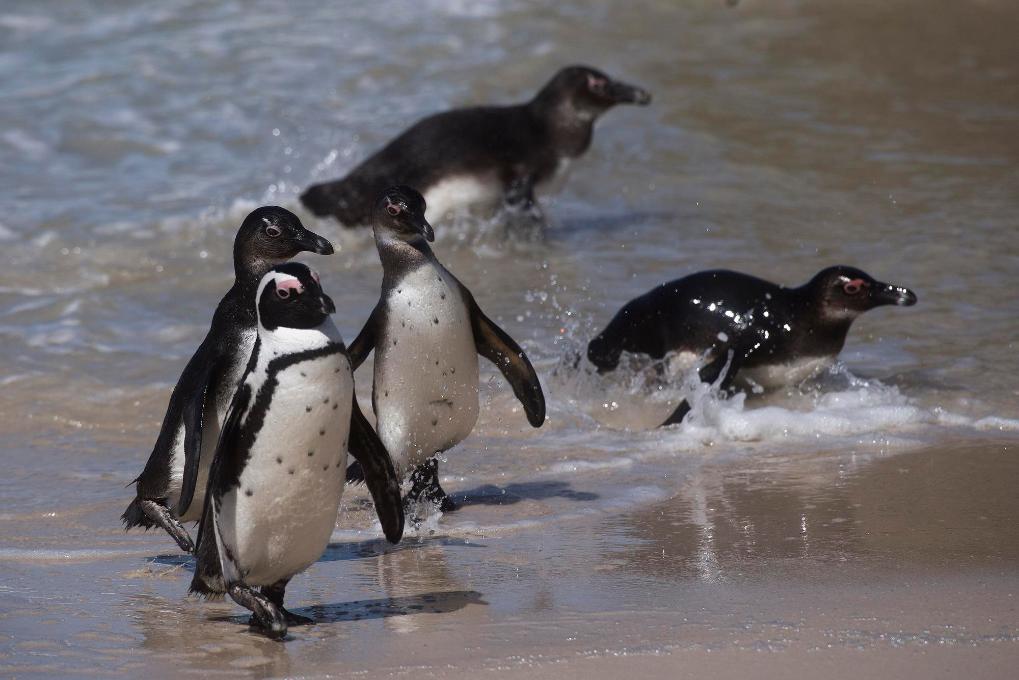 這是2021年9月29日在南非西蒙斯敦的博爾德斯海灘拍攝的捕食歸來的非洲企鵝。新華社記者 陳誠 攝