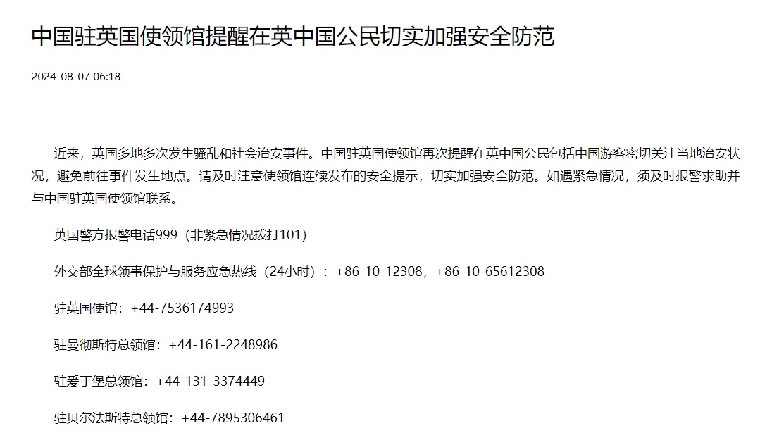 央視網(wǎng)消息:中國駐英國使領(lǐng)館8月7日發(fā)布重要通知,提醒在英中國公民包括中國游客切實加強安全防范。近來,英國多地多次發(fā)生騷亂和社會治安事件。中國駐英國使領(lǐng)館再次提醒在英中國公民包括中國游客密切關(guān)注當(dāng)?shù)刂伟矤顩r,避免前往事件發(fā)生地點。請及時注意使領(lǐng)館連續(xù)發(fā)布的安全提示,切實加強安全防范。如遇緊急情況,須及時報警求助并與中國駐英國使領(lǐng)館聯(lián)系。
