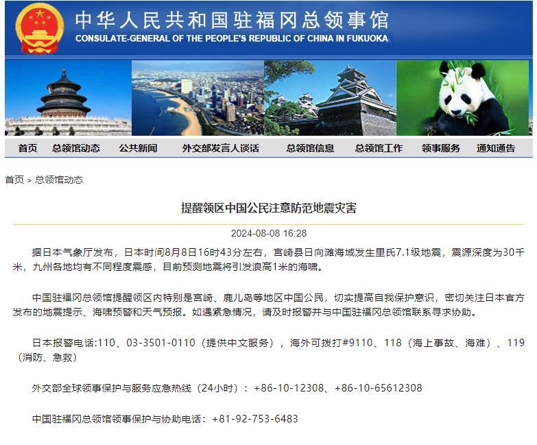 中國駐福岡總領館提醒領區(qū)內(nèi)特別是宮崎、鹿兒島等地區(qū)中國公民,切實提高自我保護意識,密切關注日本官方發(fā)布的地震提示、海嘯預警和天氣預報。如遇緊急情況,請及時報警并與中國駐福岡總領館聯(lián)系尋求協(xié)助。