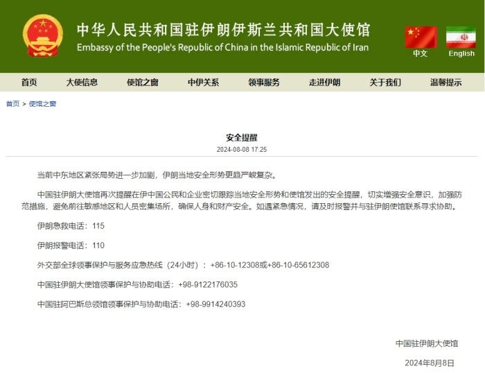 央視網(wǎng)消息:8月8日,中國(guó)駐伊朗大使館發(fā)布安全提醒稱,當(dāng)前中東地區(qū)緊張局勢(shì)進(jìn)一步加劇,伊朗當(dāng)?shù)匕踩蝿?shì)更趨嚴(yán)峻復(fù)雜。