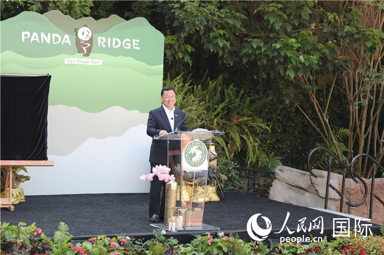 當(dāng)?shù)貢r間8月8日,美國加利福尼亞州圣迭戈動物園舉行大熊貓新館開館儀式。中國駐美大使謝鋒發(fā)表致辭。人民網(wǎng)記者 李志偉攝