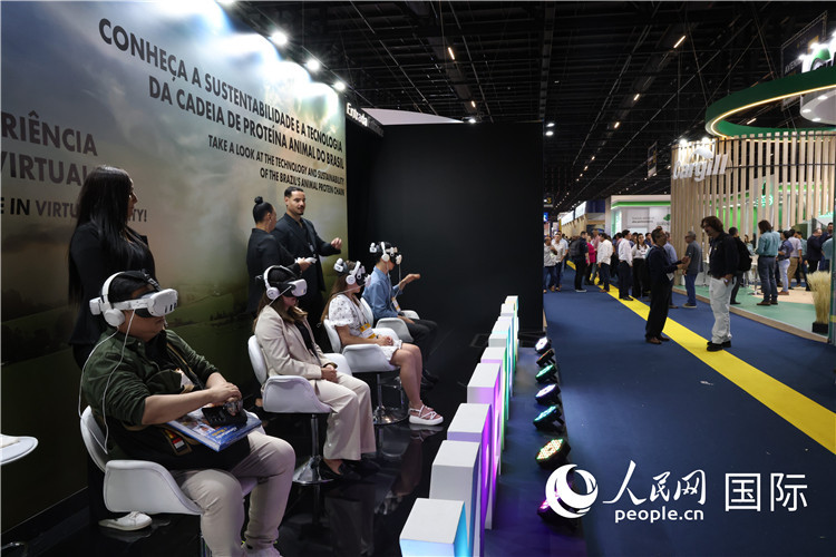 巴西國際動物蛋白展覽會現(xiàn)場,參觀者通過虛擬現(xiàn)實設備體驗巴西肉業(yè)生產(chǎn)過程。人民網(wǎng)記者 時元皓攝