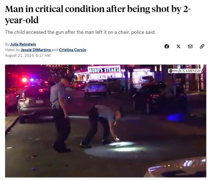 中新網(wǎng)8月21日電 綜合美媒報道,美國警方稱,日前,弗吉尼亞州一名男子被2歲兒童意外開槍擊中,目前處于危急狀態(tài)。