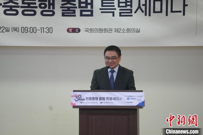 圖為中國駐韓國大使館臨時代辦方坤在成立儀式上致辭。中新社記者 劉旭 攝