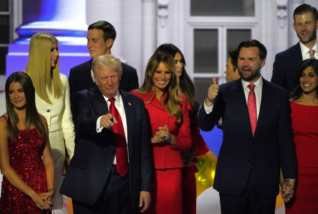 7月18日,美國前總統(tǒng)特朗普(前排左二)和共和黨副總統(tǒng)候選人萬斯(前排右二)在共和黨全國代表大會上向觀眾致意。新華社記者 吳曉凌 攝