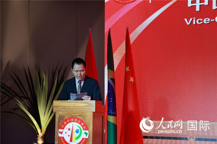 巴西中國浙江商會執(zhí)行會長陳翔廣宣讀賀電。人民網(wǎng)記者 陳海琪攝
