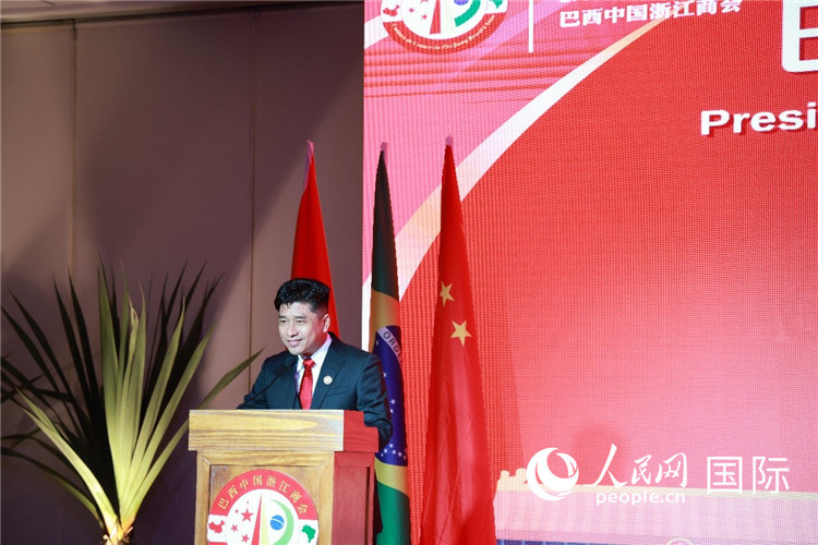 巴西中國浙江商會會長鄭俠茂發(fā)表就職演講。人民網(wǎng)記者 陳海琪攝