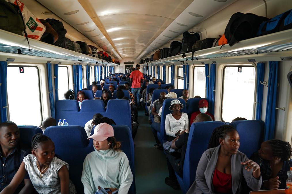 2023年9月,在肯尼亞蒙內(nèi)鐵路內(nèi)羅畢站,乘客坐在即將開往蒙巴薩的客運(yùn)列車車廂內(nèi)。新華社記者 韓旭 攝