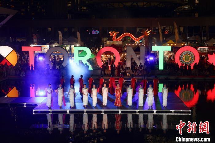當?shù)貢r間8月30日,加拿大多倫多,華人文藝團體演員在當日揭幕的第五屆多倫多龍文化節(jié)水上秀臺進行旗袍秀的夜場表演。中新社記者 余瑞冬 攝