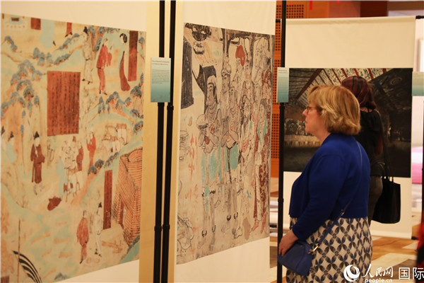 來賓在參觀敦煌高清攝影和壁畫高保真復(fù)制品。 人民網(wǎng)記者 李志偉攝