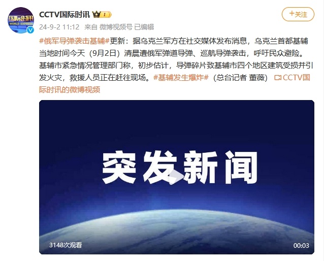 據(jù)烏克蘭軍方在社交媒體發(fā)布消息,烏克蘭首都基輔當?shù)貢r間今天(9月2日)清晨遭俄軍彈道導彈、巡航導彈襲擊,呼吁民眾避險?;o市緊急情況管理部門稱,初步估計,導彈碎片致基輔市四個地區(qū)建筑受損并引發(fā)火災,救援人員正在趕往現(xiàn)場。(總臺記者 董薇)