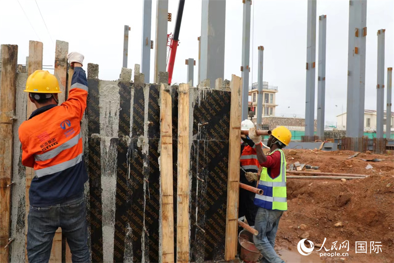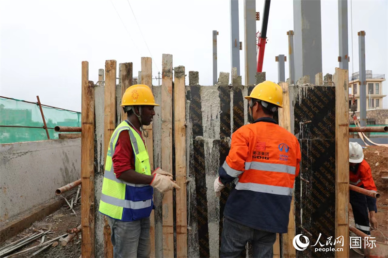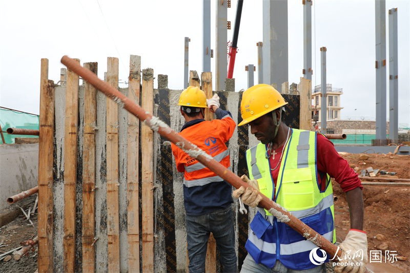 在厄立特里亞孔子學(xué)院教學(xué)樓項(xiàng)目現(xiàn)場,中厄員工正合力進(jìn)行項(xiàng)目建設(shè)。人民網(wǎng)記者 沈小曉攝
