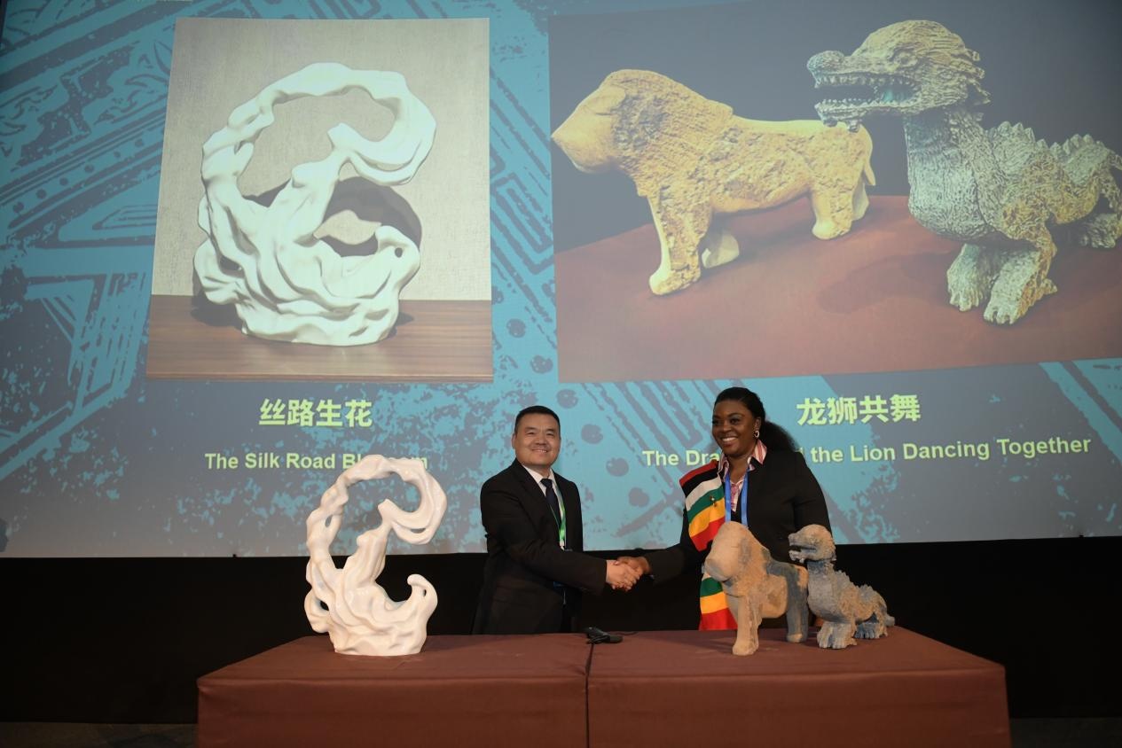 開幕式上發(fā)布了中津兩國合作攝制的紀(jì)錄片《石匠的跨時空對話》,來自津巴布韋和中國“雕刻之鄉(xiāng)”曲陽的兩位雕刻藝術(shù)家圍繞藝術(shù)造詣、傳承創(chuàng)新、文明互鑒展開對話交流。雙方還互贈象征中津傳統(tǒng)友好的石雕藝術(shù)作品《絲路生花》和《龍獅共舞》。
