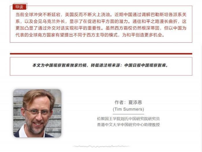 中國近期的外交努力得到了世界多地的廣泛支持。持續(xù)的沖突表明西方霸權(quán)仍然根深蒂固,幸而全球南方的崛起為逐步消除和平面臨的障礙帶來了希望。