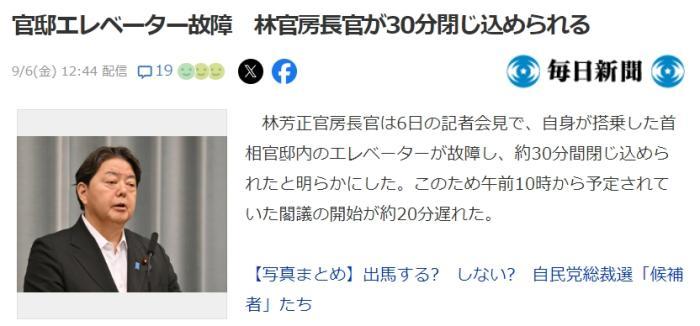 中新網(wǎng)9月6日電 據(jù)日本《每日新聞》報道,當(dāng)?shù)貢r間6日上午,日本首相官邸內(nèi)的電梯突發(fā)故障,導(dǎo)致正在電梯中的內(nèi)閣官房長官林芳正被困其中長達(dá)30分鐘。
