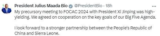 同日,塞拉利昂總統(tǒng)比奧也發(fā)文稱:我在2024年中非合作論壇開幕前,與習(xí)近平主席的會晤成果豐碩。