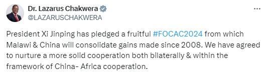 馬拉維總統(tǒng)查克維拉發(fā)文表示,馬拉維和中國將在雙邊和中非合作框架內(nèi)培育更穩(wěn)固的合作。