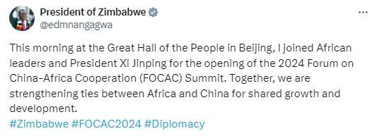 9月5日峰會開幕當(dāng)天,津巴布韋總統(tǒng)姆南加古瓦發(fā)文表示:今天上午,我在北京人民大會堂與非洲各國領(lǐng)導(dǎo)人和習(xí)近平主席共同出席了2024年中非合作論壇峰會開幕式。我們共同努力,加強中非關(guān)系,促進(jìn)共同增長和發(fā)展。