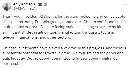 埃塞俄比亞總理阿比9月4日在社交媒體發(fā)文表示:感謝習(xí)近平主席的熱情接待和我們今天的寶貴會談。埃塞俄比亞非常感謝中國持續(xù)和多方面的支持。