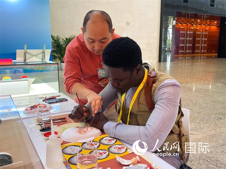 非洲媒體記者在新聞中心體驗(yàn)彩塑京劇臉譜。人民網(wǎng)記者 于洋攝