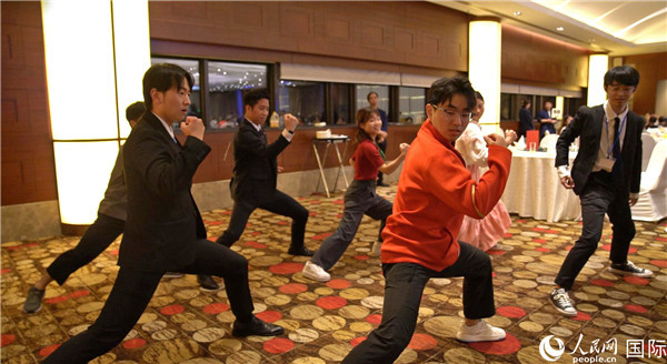 晚宴期間,日本少林寺拳法集團青年代表團成員與北京體育大學學生交流拳法。人民網(wǎng)記者 張麗婭攝
