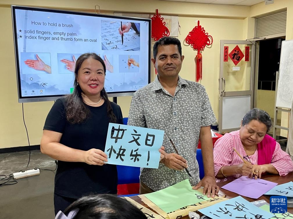 4月3日,在位于斯里蘭卡中央山脈南麓的薩伯勒格穆沃大學(xué),薩伯勒格穆沃大學(xué)孔子課堂院長朱頌(左)在“國際中文日”活動(dòng)上與學(xué)校教職工漢語培訓(xùn)班的學(xué)員互動(dòng)。新華社發(fā)(薩伯勒格穆沃大學(xué)孔子課堂供圖)