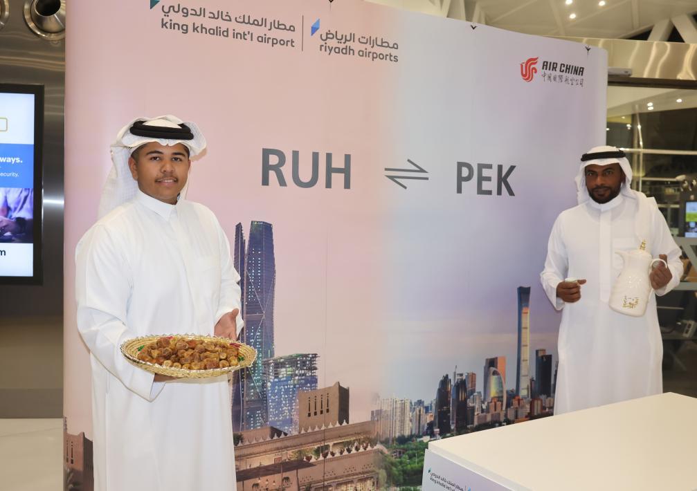 5月6日,工作人員在沙特阿拉伯利雅得哈立德國王機(jī)場(chǎng)迎接國航北京至利雅得直飛首航航班的旅客。新華社記者王海洲攝