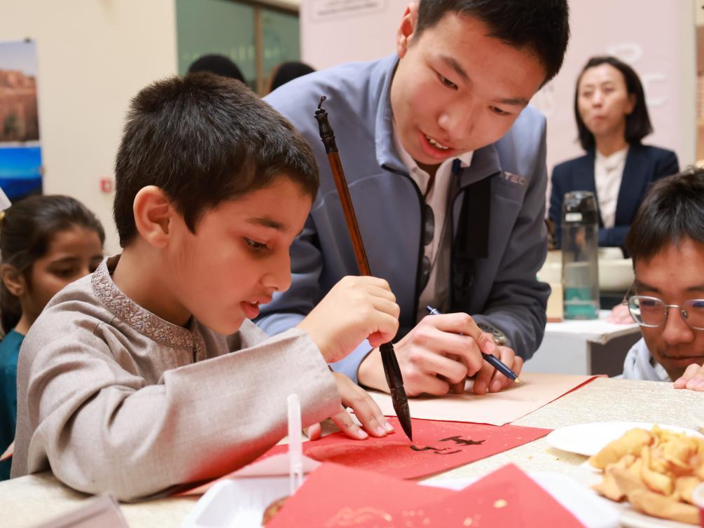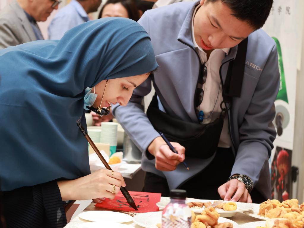 1月29日,沙特阿拉伯利雅得蘇爾坦親王大學(xué)學(xué)生在孔子學(xué)院展位體驗(yàn)中國書法。新華社記者王海洲攝