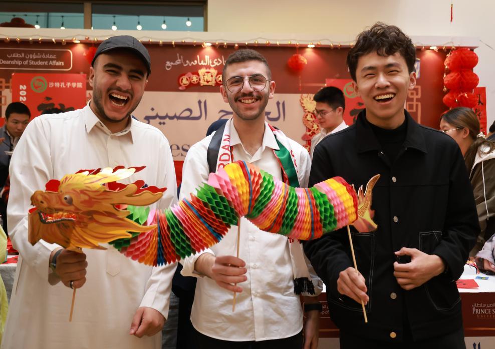1月29日,沙特阿拉伯利雅得蘇爾坦親王大學(xué)學(xué)生在孔子學(xué)院展位與紙龍合影。新華社記者王海洲攝