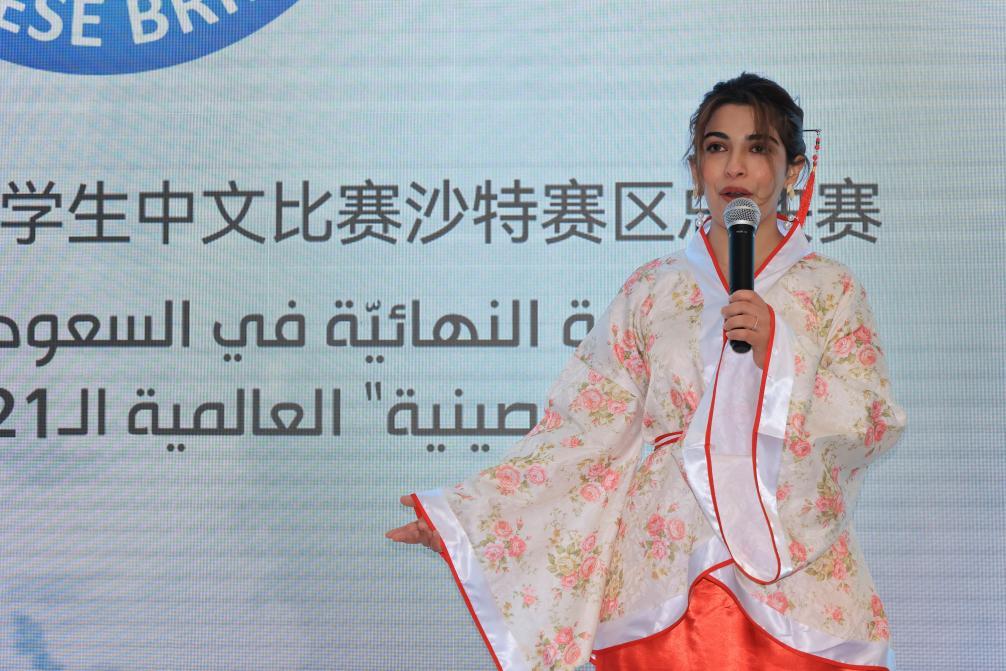 2022年7月20日,在沙特阿拉伯首都利雅得,參賽選手在“漢語橋”世界大學(xué)生中文比賽沙特賽區(qū)決賽中演講。新華社記者王海洲攝