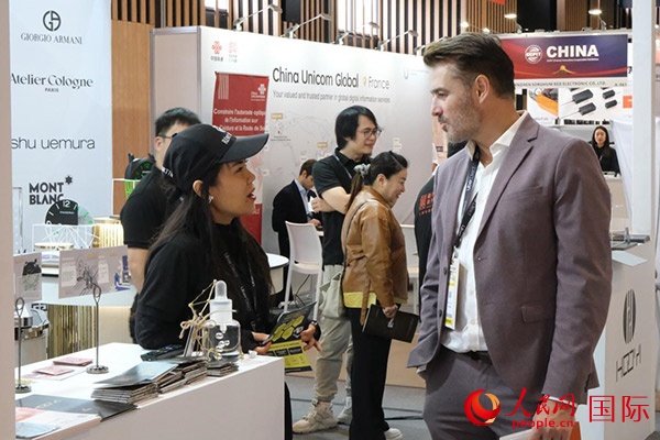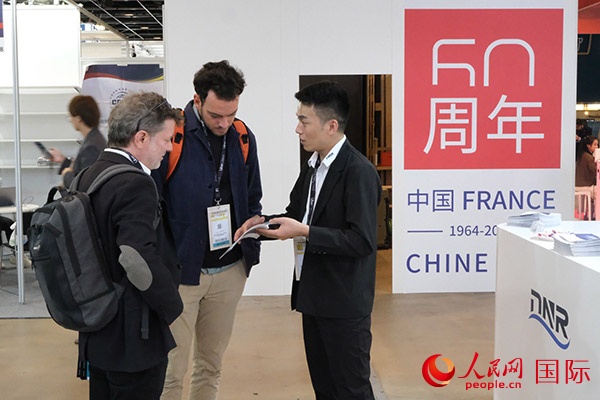 法國(guó)從業(yè)者在中國(guó)展區(qū)前咨詢(xún)。人民網(wǎng)記者 于超凡攝
