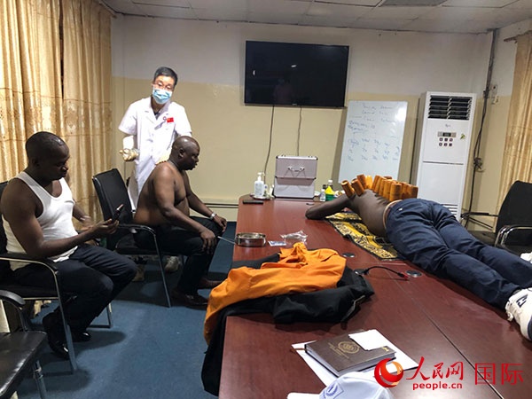 中國醫(yī)生在對(duì)當(dāng)?shù)孛癖娺M(jìn)行中醫(yī)診療。人民網(wǎng)記者 黃培昭攝