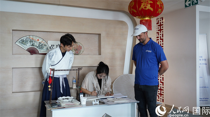 遞簽來(lái)賓興致勃勃地體驗(yàn)中國(guó)書(shū)法。人民網(wǎng) 劉暢攝