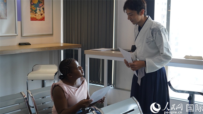 王清超老師耐心解答來(lái)賓對(duì)中文課程的咨詢。人民網(wǎng) 劉暢攝
