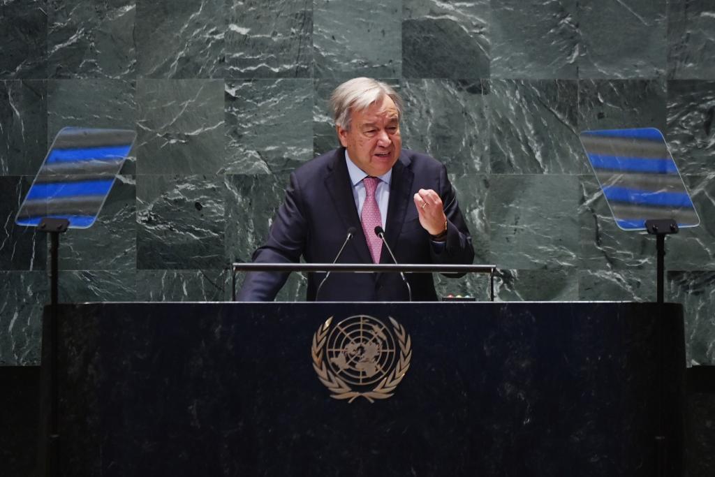 9月22日,在位于紐約的聯(lián)合國(guó)總部,聯(lián)合國(guó)秘書(shū)長(zhǎng)古特雷斯在聯(lián)合國(guó)未來(lái)峰會(huì)上致辭。新華社記者李睿攝