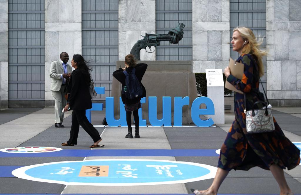 9月23日,在美國(guó)紐約,與會(huì)者從聯(lián)合國(guó)未來(lái)峰會(huì)會(huì)場(chǎng)外走過(guò)。新華社記者吳曉凌攝