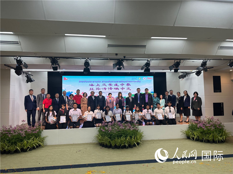 中國(guó)駐泰國(guó)大使館一等秘書(shū)王歡(左)為一等獎(jiǎng)獲獎(jiǎng)?wù)哳C獎(jiǎng)。人民網(wǎng)記者 簡(jiǎn)承淵攝