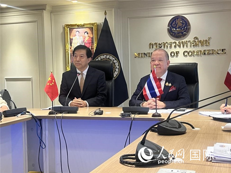中國駐泰國大使韓志強(qiáng)和泰國商業(yè)部長披差共同會見中泰兩國記者。人民網(wǎng)記者 張矜若攝