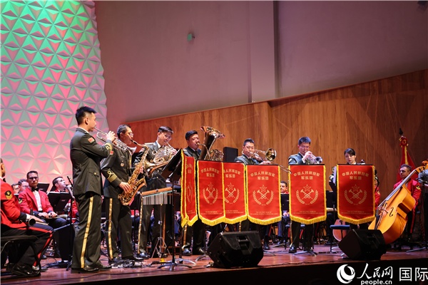 巴西海軍陸戰(zhàn)隊(duì)軍樂(lè)團(tuán)、中國(guó)人民解放軍軍樂(lè)團(tuán)演出分隊(duì)部分隊(duì)員同臺(tái)演出。人民網(wǎng)記者 時(shí)元皓攝
