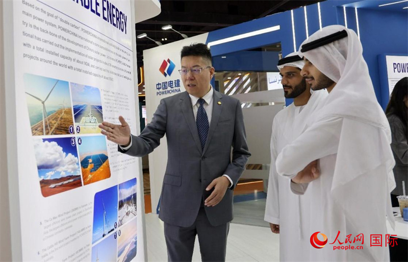 中國電建中東北非區(qū)域總部負責人向觀眾介紹公司承建的可再生能源項目。人民網(wǎng)記者 管克江攝