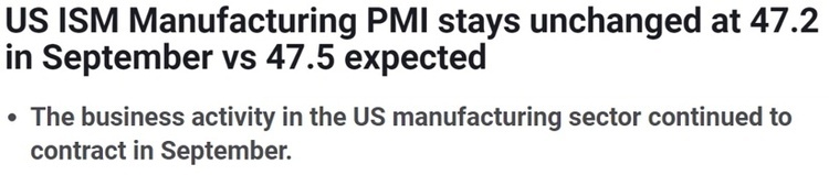 美國供應(yīng)管理學(xué)會公布的最新數(shù)據(jù)顯示,美國9月制造業(yè)采購經(jīng)理指數(shù)(PMI)為47.2,繼續(xù)低于50這一榮枯分界線,表現(xiàn)不及市場預(yù)期。