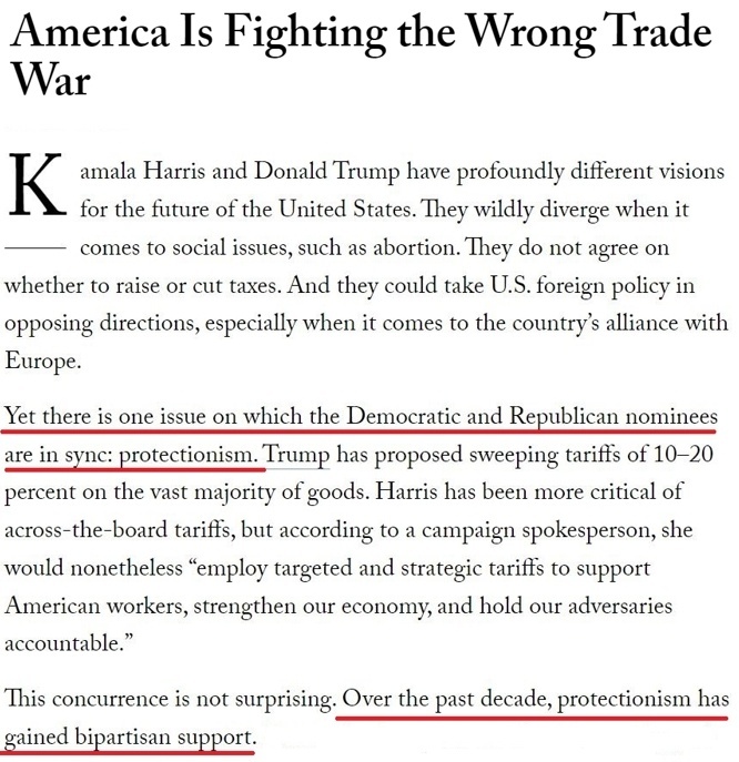 美國《外交》雜志發(fā)表題為《美國打錯了貿(mào)易戰(zhàn)》的文章指出,盡管美國兩黨的總統(tǒng)候選人哈里斯和特朗普在很多問題上的立場大相徑庭,但卻在實(shí)行保護(hù)主義問題上有著相似的態(tài)度。