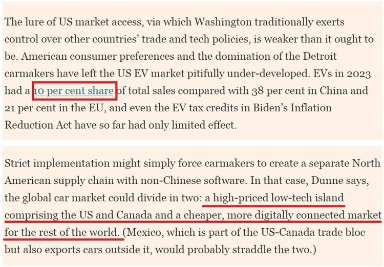 文章指出,美國自己的電動汽車市場一直處于欠發(fā)達(dá)狀態(tài),2023年電動汽車僅占到美國汽車總銷量的10%左右,遠(yuǎn)低于世界其他主要地區(qū)。即便是《通脹削減法案》中的電動汽車稅收抵免政策,到目前為止的效果也極其有限。