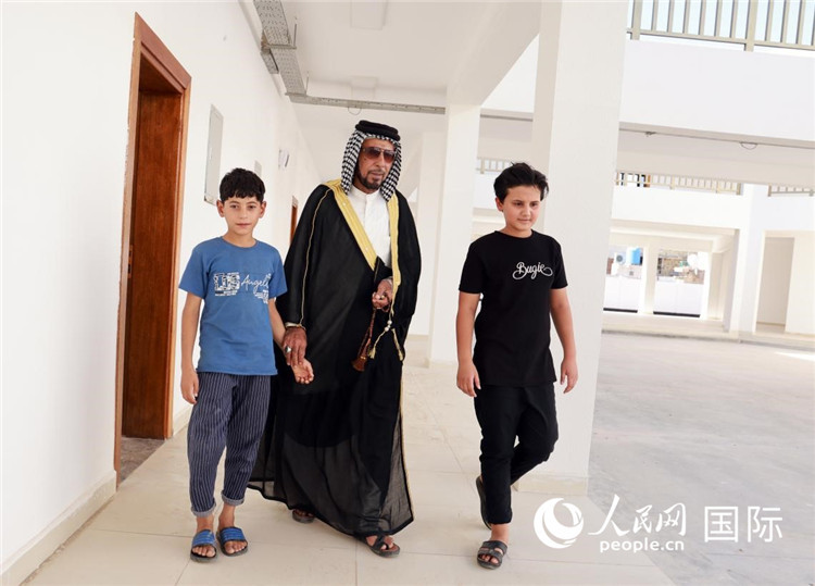 阿卜杜拉帶著孩子們?cè)趨⒂^已完工學(xué)校。人民網(wǎng)記者 管克江攝
