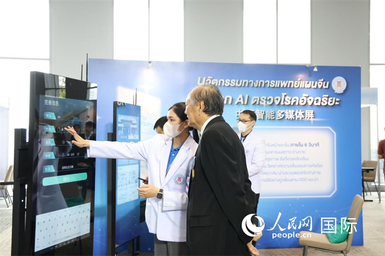 活動現(xiàn)場,泰國華僑中醫(yī)院工作人員向嘉賓展示醫(yī)院智能多媒體屏。人民網(wǎng)記者 楊一攝